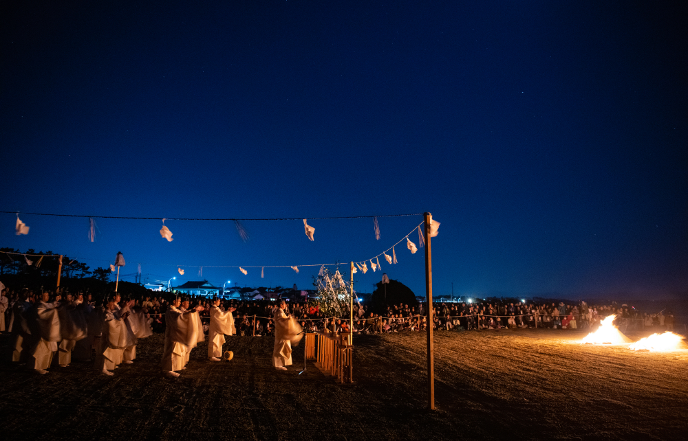 19時になると、浜に御神火(ごじんか)が焚かれ、注連縄(しめなわ)が張り巡らされた斎場の中に、神々の拠り所となる2本の神籬(ひもろぎ)が据えられる。その傍らに鎮座するのは、神々の先導役である龍蛇神(りゅうじゃじん)だ。やがて祭主が海に向かって祝詞(のりと)を奏上すると、龍蛇神に導かれ、海の彼方から神々が出雲の地へと来臨される。