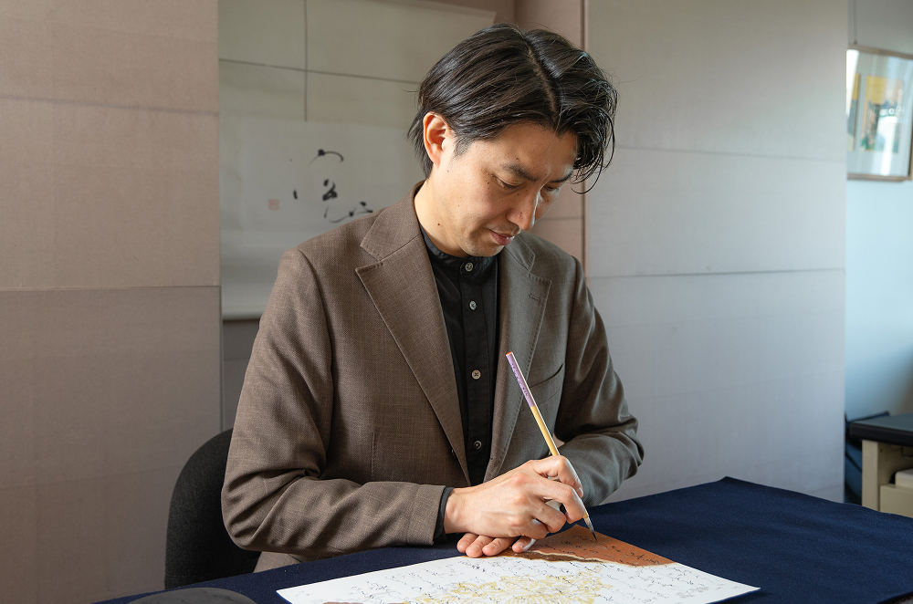 「大学卒業後の進路で悩んでいた時、江戸初期の画家 俵屋宗達の絵の上に、本阿弥光悦が大きな字で和歌を書いた『鶴下絵三十六歌仙和歌巻』という作品を見て、衝撃を受けました。それまで学んできた平安時代の繊細な〝かな〞とはまったく違った光悦の表現を見て、こんな風に表現をしても良いんだ!と気付かされたんです。平安時代は、日本人として大切にしたいことは何か、どういった美意識で国づくりをしていくべきか、ということに向き合った時代でした。そこから生まれたのが、〝平安の雅〞と言われるもので、〝かな〞もその一部です。要するに、〝雅〞とは、特定の形にとらわれず、時代に合わせて形を整える〝形式美〞だということなんです。それ以来、僕はそのことを伝えたい、〝現代の雅〞を表現したいという思いで、〝書〞や作品を作っています。昨年仲間とつくった日本文化を楽しめる『東依(とうい)』というカフェギャラリーでの活動もその一つです。今、四季折々の和歌を書き溜めていて、これを60歳になったら自分の〝書〞で巻物にするのが夢です。過去、詠み人本人の〝書〞で残された巻物って、実は例がないんです。だからこれができたら書道の歴史に依拠する作品になると思っています。僕が本阿弥光悦の作品に衝撃を受けたように、次の世代が僕のそんな作品や活動を見て、そこにある〝雅イズム〞を感じてくれたら嬉しいですね」