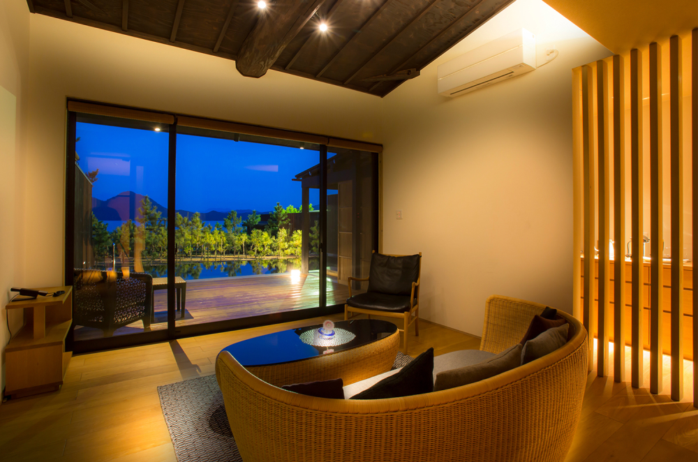 日本三景・天橋立で知られる宮津市に位置する「天橋立離宮 星音」。全7室の客室すべてがオーシャンビューで、塩分濃厚で殺菌力に優れた多彩な効能を持つ「金温泉」と、肌の新陳代謝を促進する「銀温泉」の2種類の温泉を全室に完備している。さらに国内外から取り寄せたデザイン性の高いインテリアも魅力のひとつ。食事は地元・丹後で仕入れた無農薬野菜や海の幸を活かした創作会席を楽しめる。美しい海景と星空両方を満喫できる、贅沢なひとときを過ごしてみては。